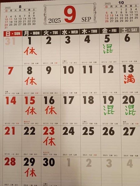 9月営業日のご案内
