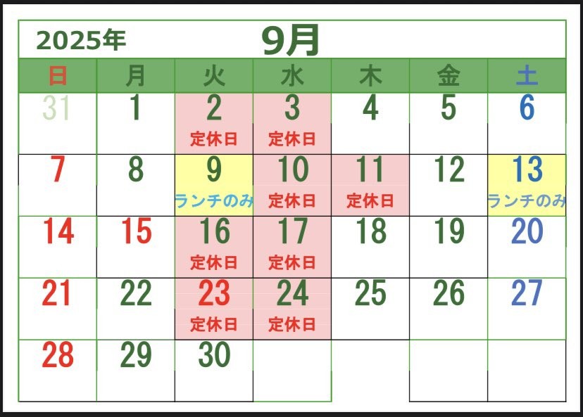 9月営業日のご案内